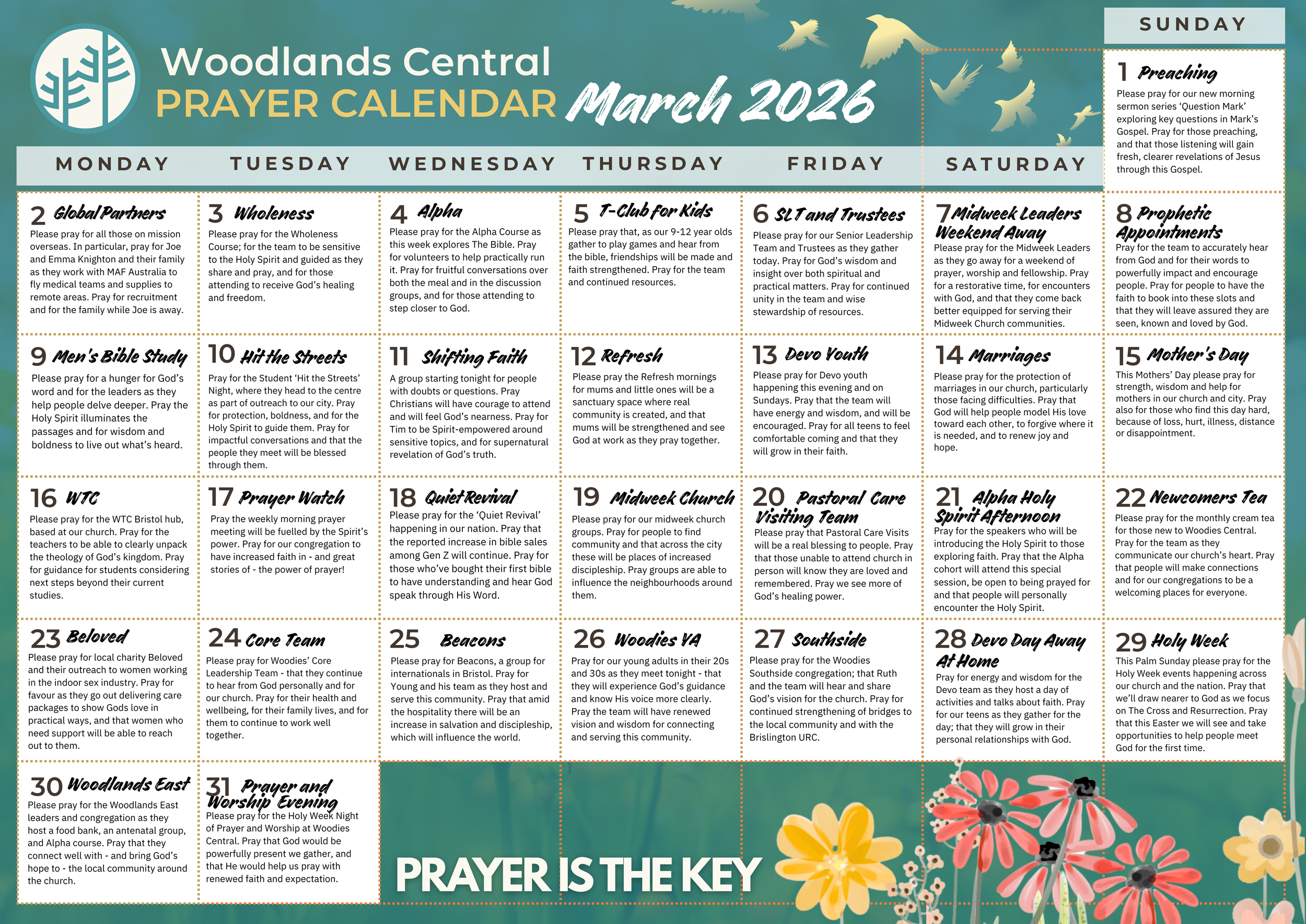 Each month, you’re invited to pray for church and all that is happening with our monthly Prayer Calendar. You can view and download the calendar below as a PDF.